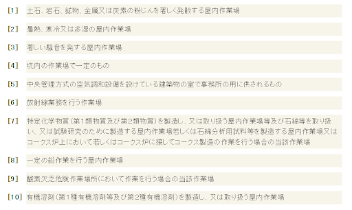 上記は労働安全衛生法の第65条で定められている作業環境測定が必要な作業場の一覧です。