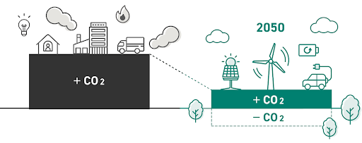 排出量そのものをゼロにするのではなく、まずはできるだけ排出を減らし、それでも残ってしまう分については、森林づくりや再エネの普及など「地球にプラスになる取り組み」で埋め合わせて、全体としてプラスマイナスゼロにするという考え方となります。