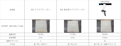 仮にA社のエアスプレーガンで、GM1030Gと同様の仕上がりにするためには、塗料を約2倍消費して、塗装時間を長くしなければなりません。